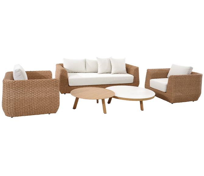 Каркас мебели выполнен из алюминия с порошковым покрытием – он легкий, прочный и устойчивый к коррозии. Плетение из техноротанга не боится влаги, солнечных лучей и перепадов температур, сохраняя аккуратный внешний вид на протяжении многих сезонов. Мягкие подушки с обивкой из специальной ткани приятны на ощупь, не впитывают влагу и практичны в уходе.