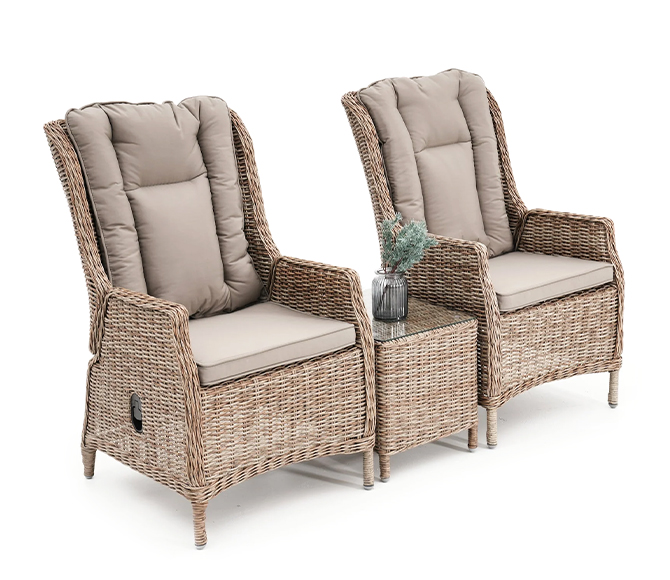 Каркас мебели выполнен из алюминия с порошковым покрытием, что обеспечивает прочность, устойчивость к коррозии и длительный срок службы. Плетение из техноротанга устойчиво к воздействию влаги, ультрафиолета и перепадов температур, сохраняя аккуратный внешний вид даже при активной эксплуатации на улице.